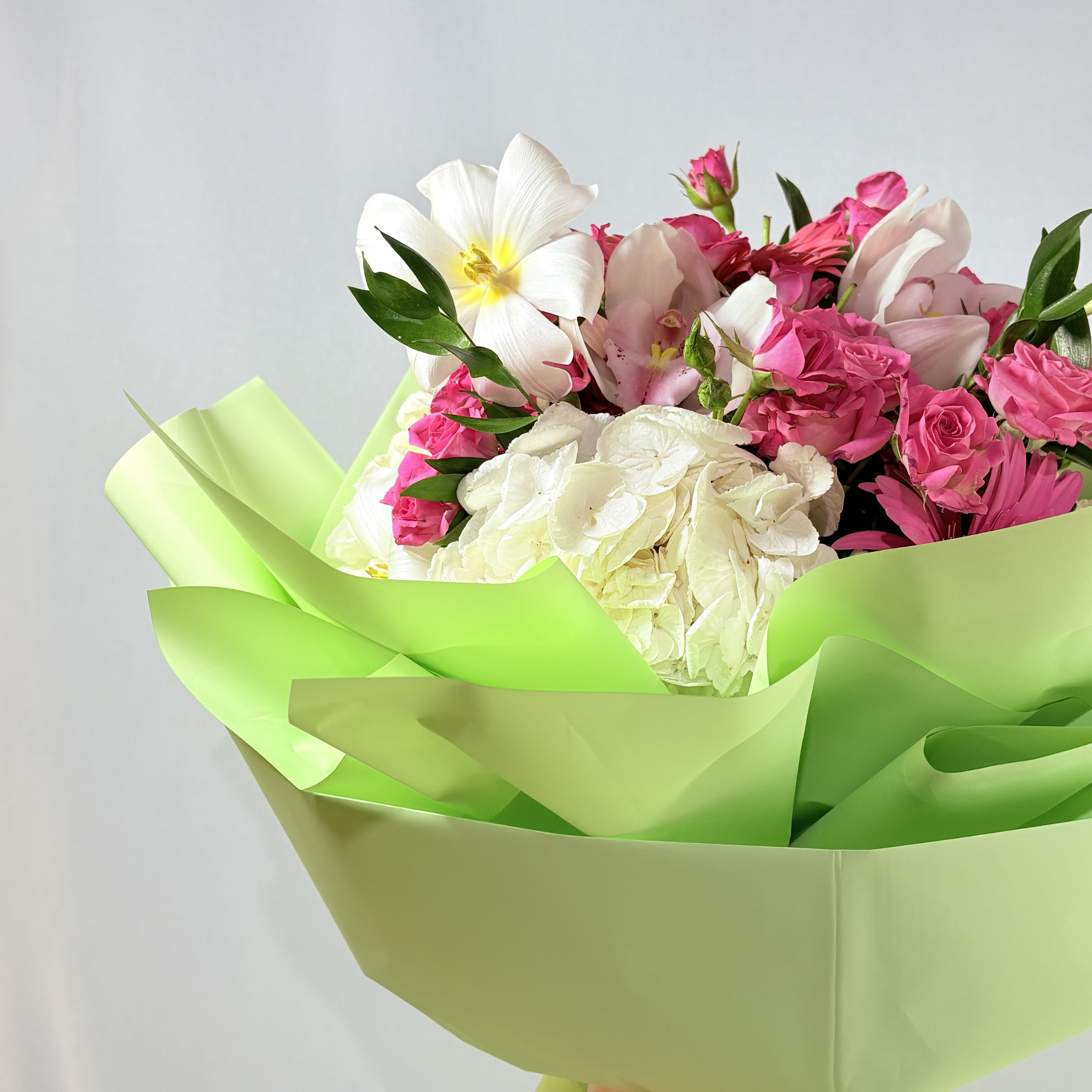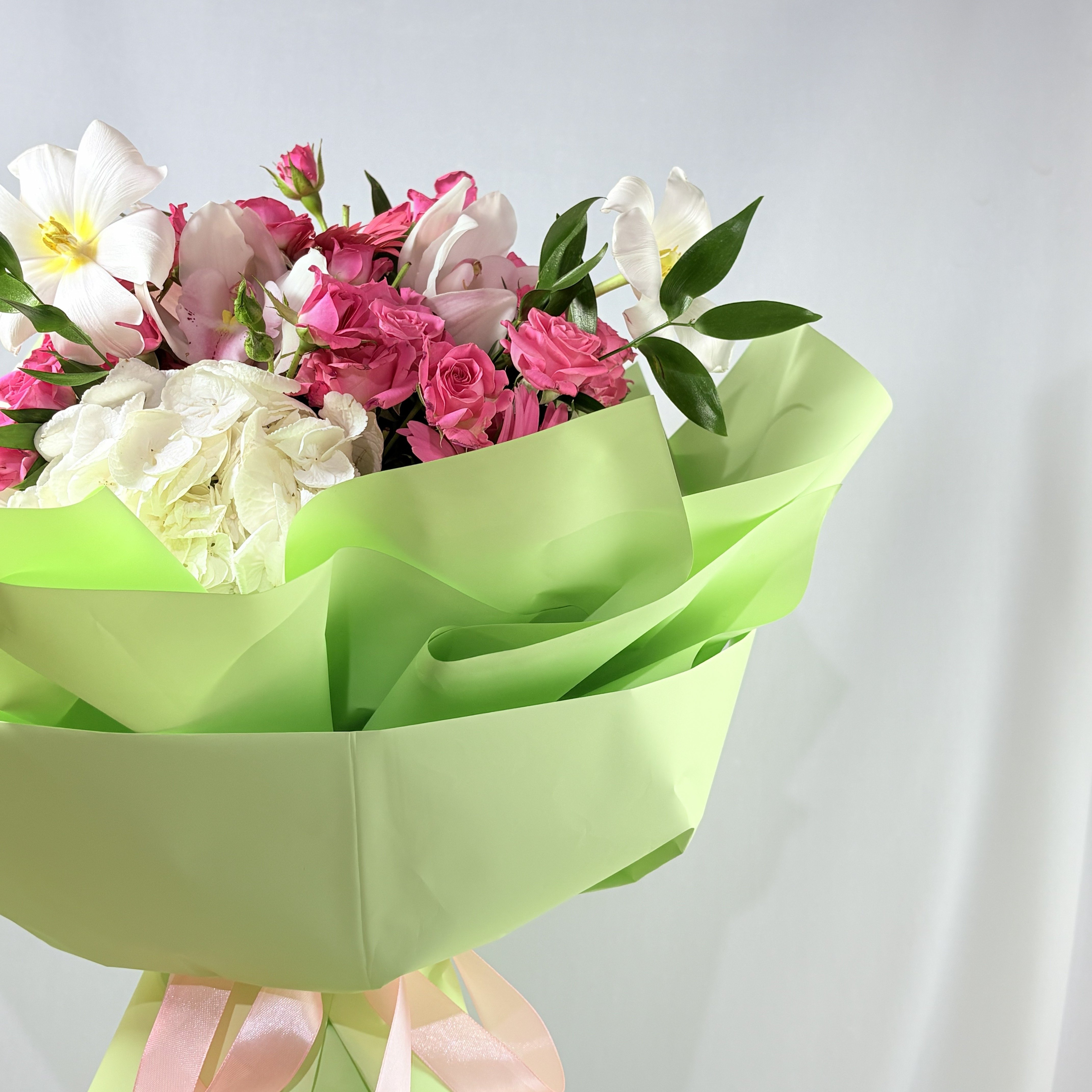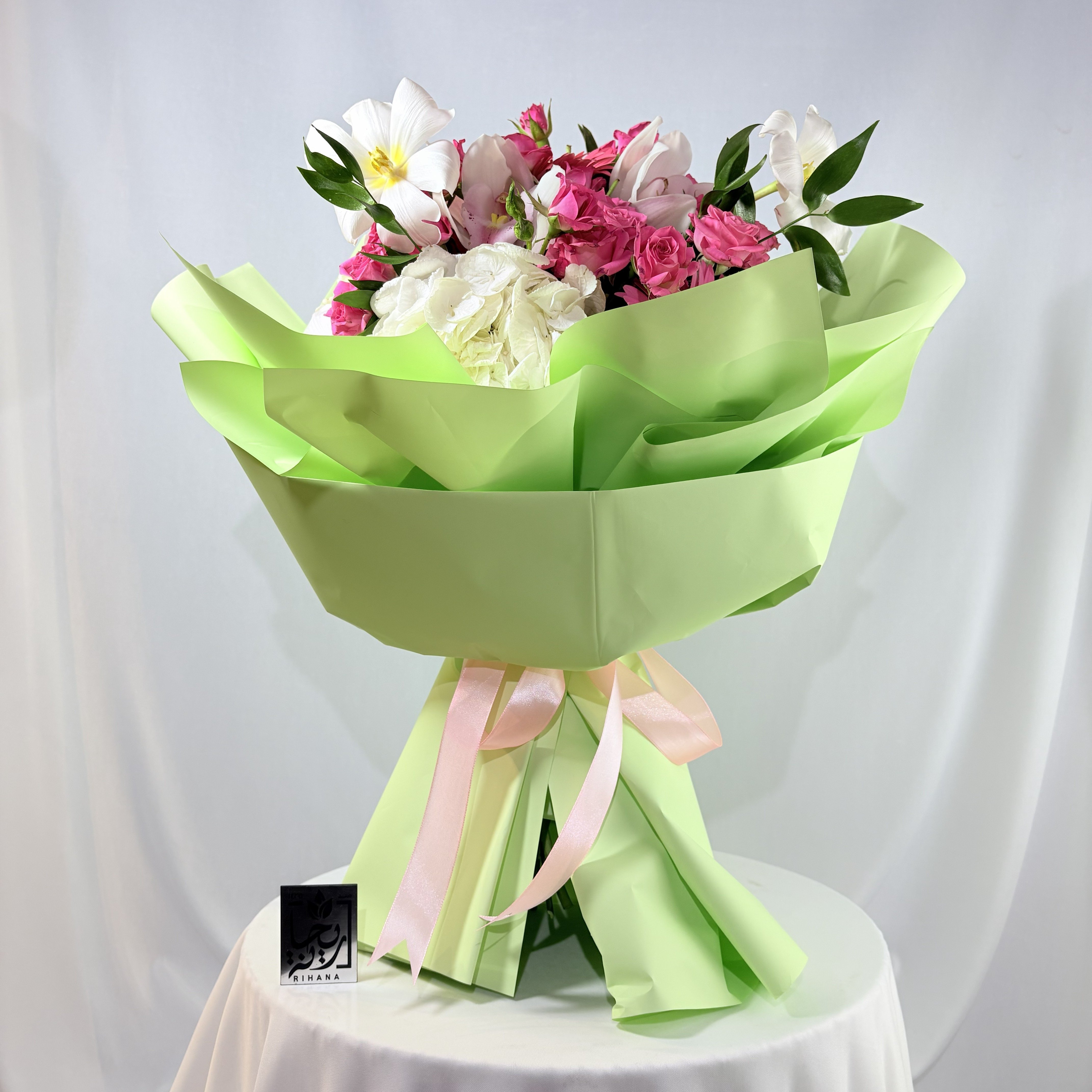بوكيه فخم بتغليف بلون أخضر فاتح يرمز للهدوء، وتنسيق وردي وأبيض يعبّر عن الأناقة والأنوثة.